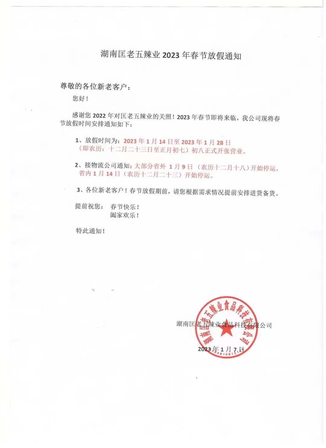 2023年春節(jié)將至,首先感謝所有的新老客戶朋友們對(duì)匡老五辣業(yè)的鼎力支持和愉快合作,匡老五辣業(yè)全體同仁在此給您拜個(gè)早年,提前祝您新年快樂(lè)、全家幸福、健康、平安,F(xiàn)將我公司春節(jié)放假事宜通知如下: