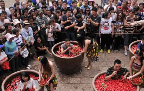 此次比賽進(jìn)入決賽的共有9位吃辣高手,比賽方式為將身體泡進(jìn)直徑1.1米泡滿辣椒的大缸中,感覺從內(nèi)而處的辣爽。進(jìn)入決賽的9位選擇有些甚至都辣哭了,最終,四川成都的鎖先生以2分鐘47個(gè)辣椒的成績,贏得了24K黃金打造的金辣椒。